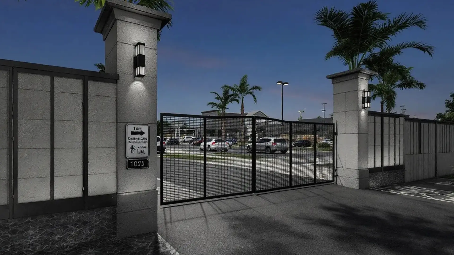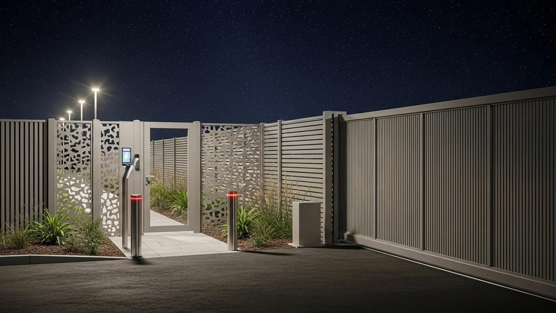 Design sliding or bi-parting vehicle gates so their panel lines continue the slat/mesh patterns of the fence. Avoid “breaks” in the visual rhythm when gate opens.